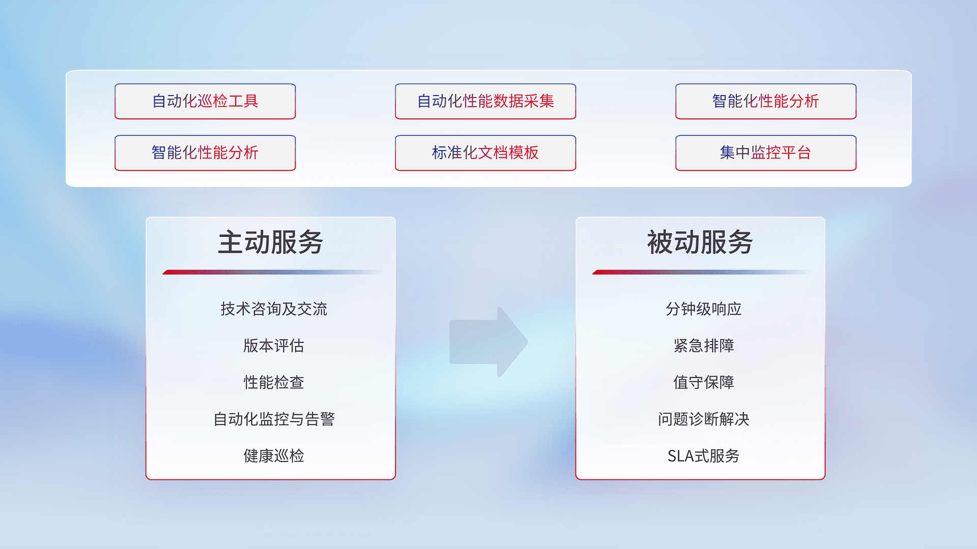 智能化工具和标准化文档,,保障服务质量,,,,提供主动服务(包含技术咨询、、版本评估、、、、性能检查、、、自动化监控与告警、、、、健康巡检)和被动服务包含(分钟级响应、、、紧急排障、、、值守保障、、、、问题诊断解决、、SLA服务)。。