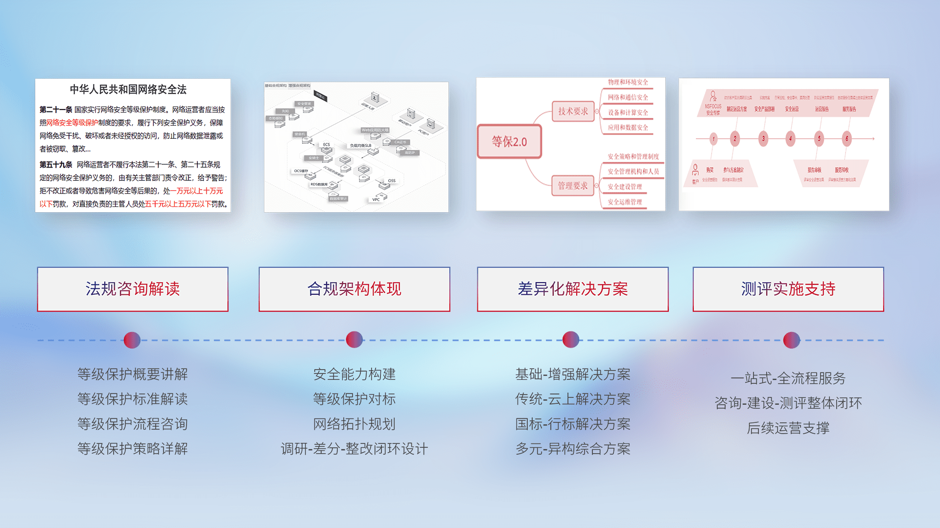 通过专业的法律咨询解读、、、、合规架构体现、、差异化解决方案、、测试实施支持等服务,,为客户量身打造等保合规体系。。
